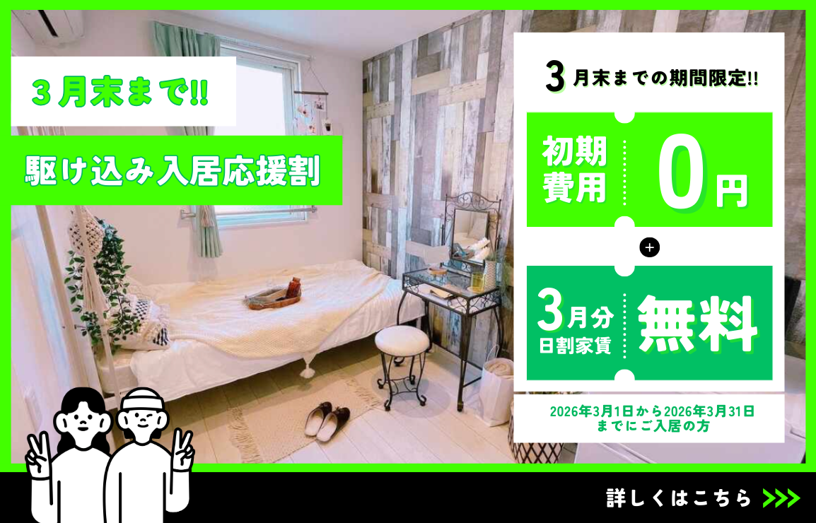 初期費用3万円でご入居できます♪(契約内容によって変動します。)毎月の出費をグッと抑えられます!水道光熱費・Wi-fi・生活に必要な備品(トイレットペーパー、洗剤類等)・さらに洗濯機・乾燥機はコイン式ではなく無料で使い放題♪