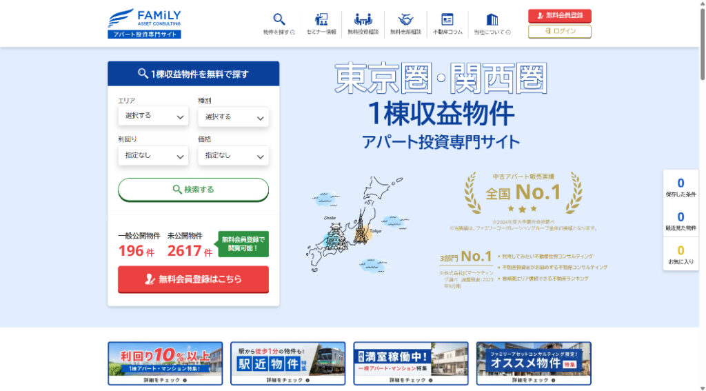 一棟収益物件に特化した情報提供とサポートを行うサイトです。東京・関西を中心とした物件情報のほか、融資や税務に関するアドバイスも提供し、投資家が安心して資産運用できる環境を整えています。初心者から経験者まで幅広く活用できるサイトです。