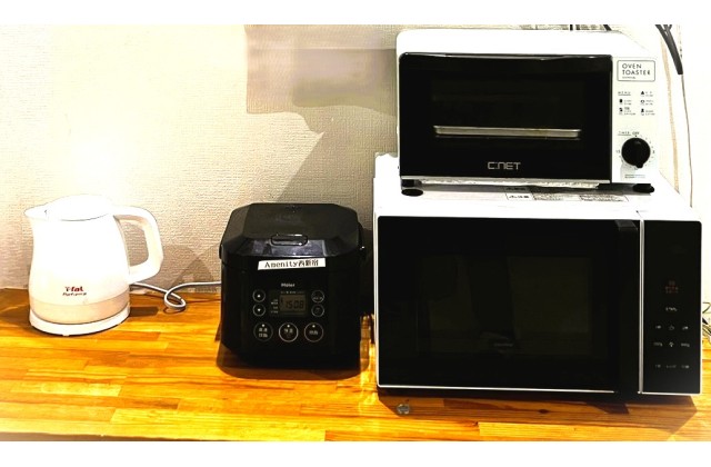 共用部にはキッチン、電子レンジ、トースター、炊飯器、調理器具を完備